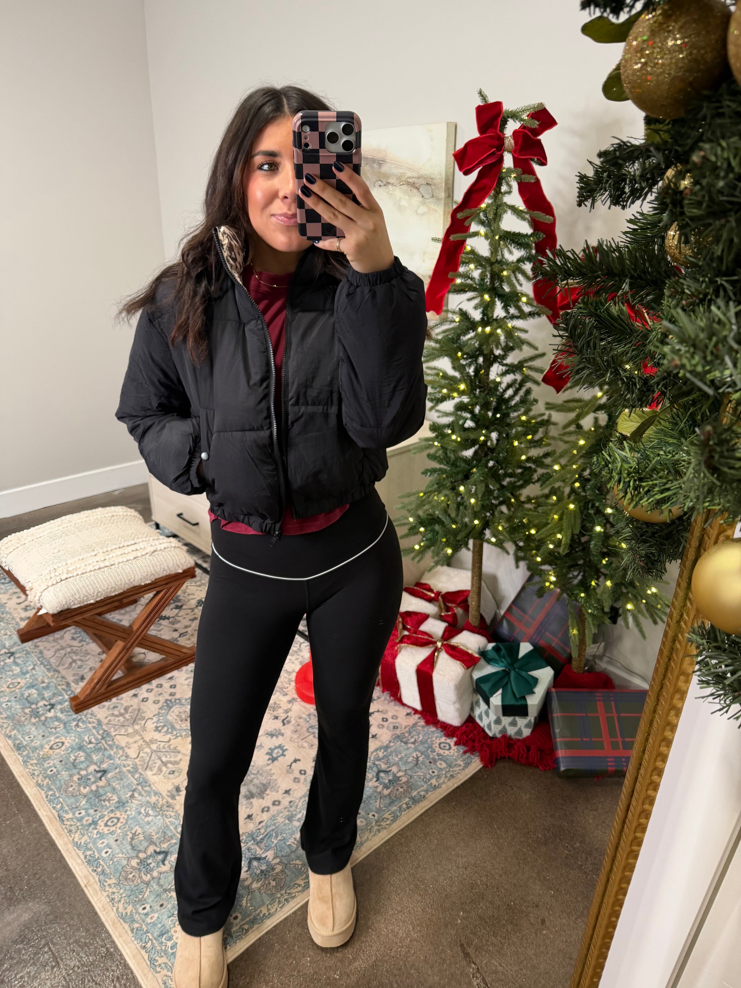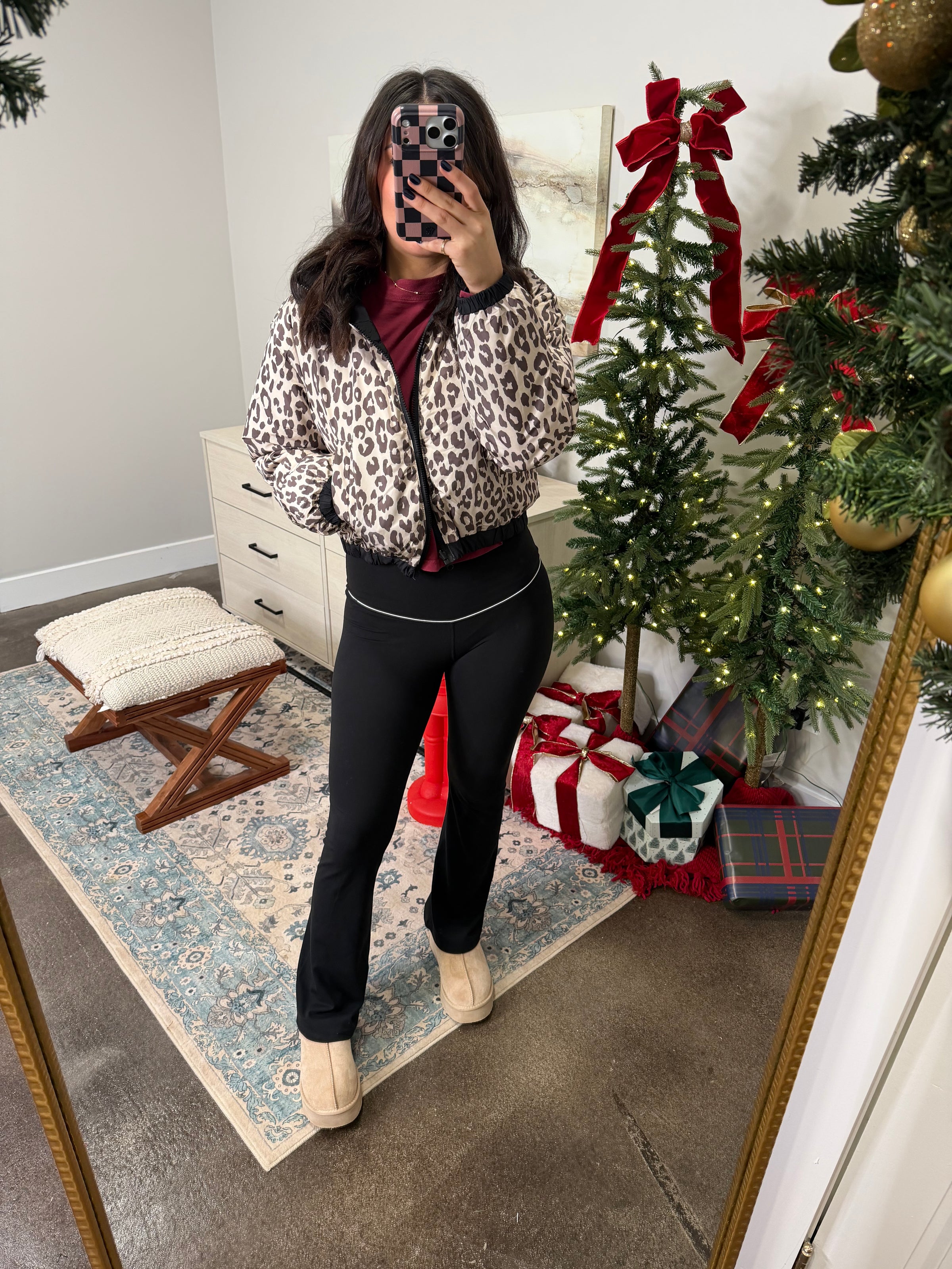 A perfect jacket for spicing up a lazy day outfit. It is reversible so you can wear it cheetah or black. The model is 5’5 wearing a size small.