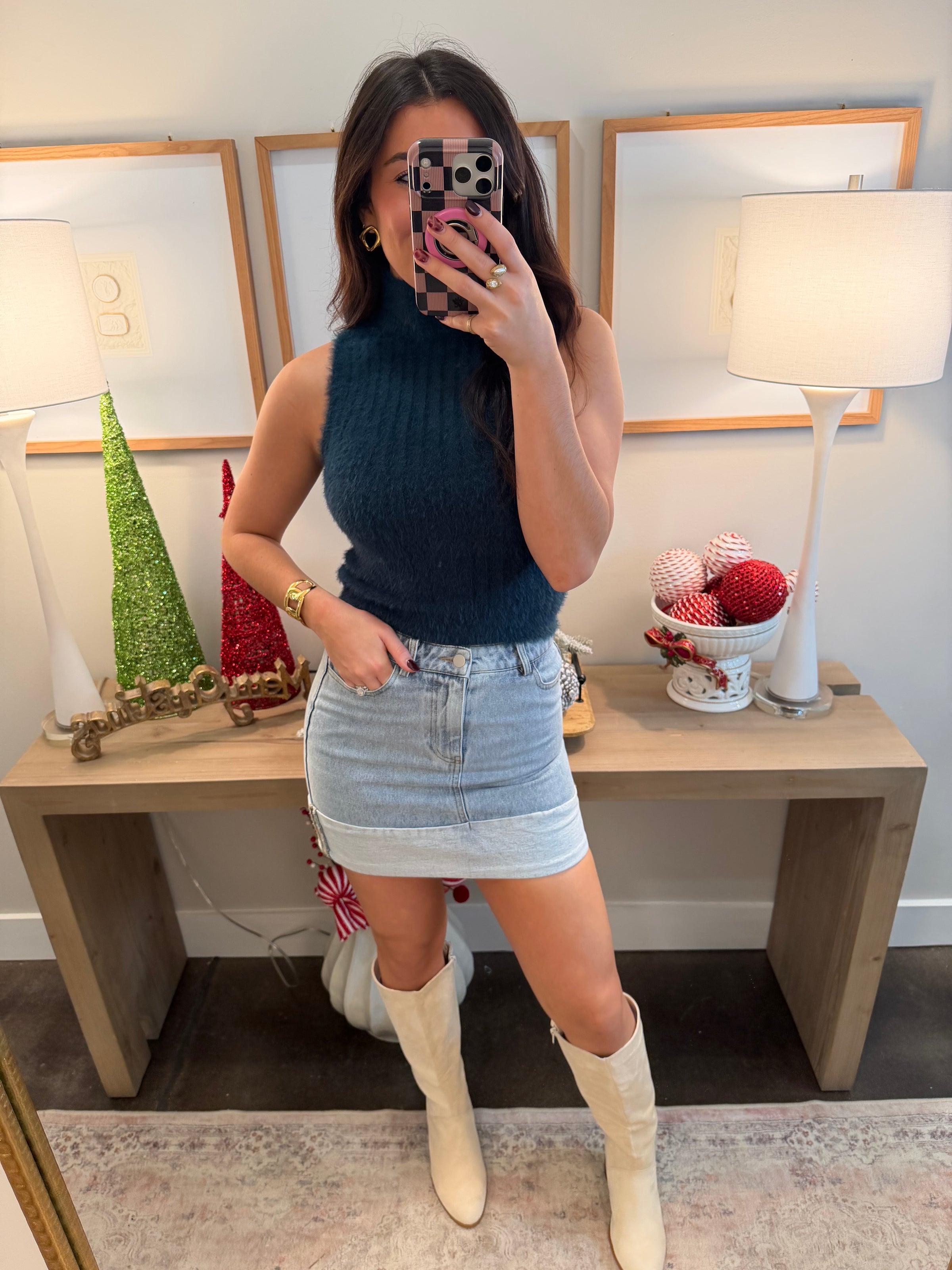 The perfect top to layer with this Holiday Season. It is super stretchy and runs true to size.