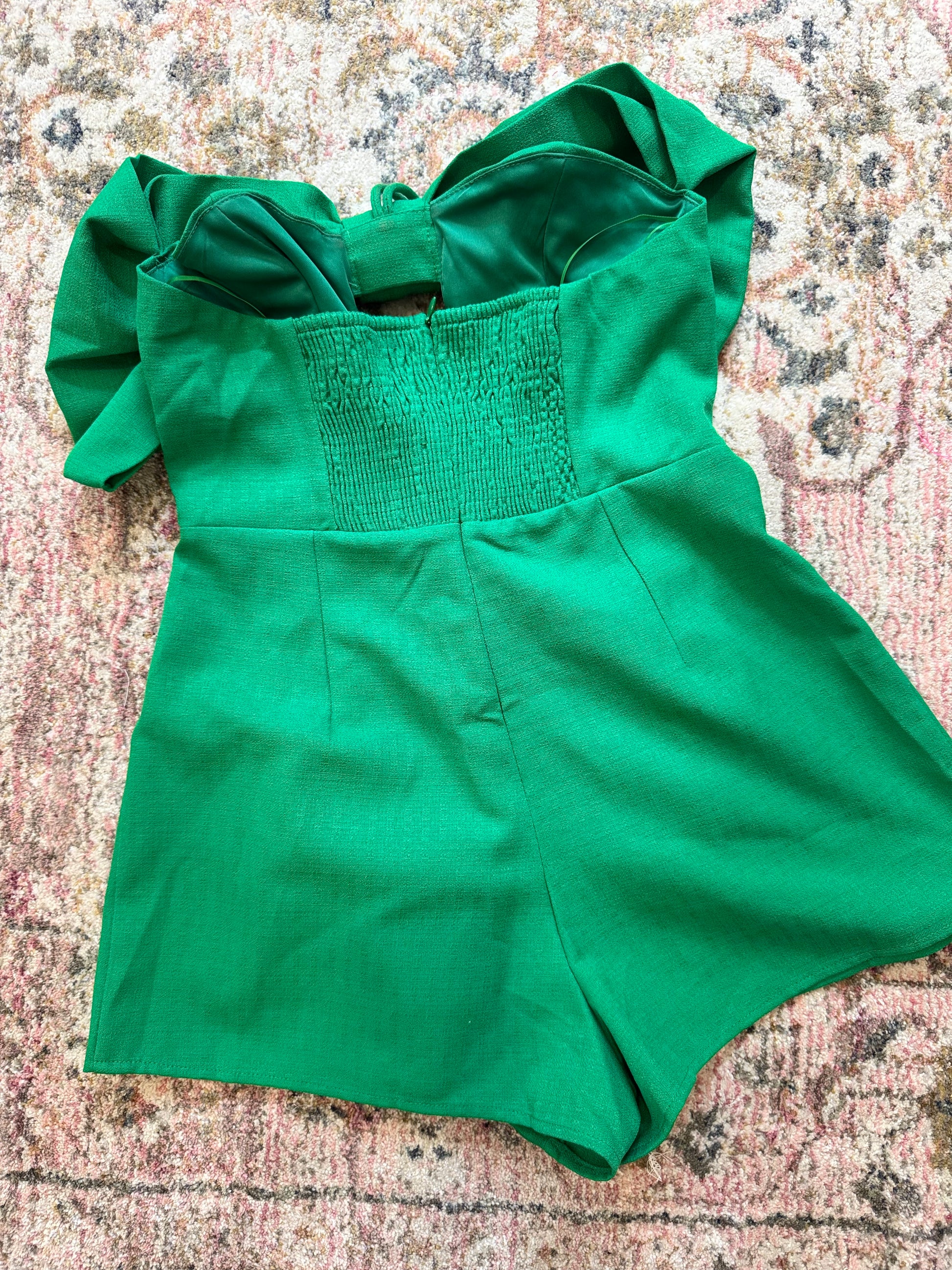 This romper ties around your neck an zipper in the back with an elastic band. Runs true to size