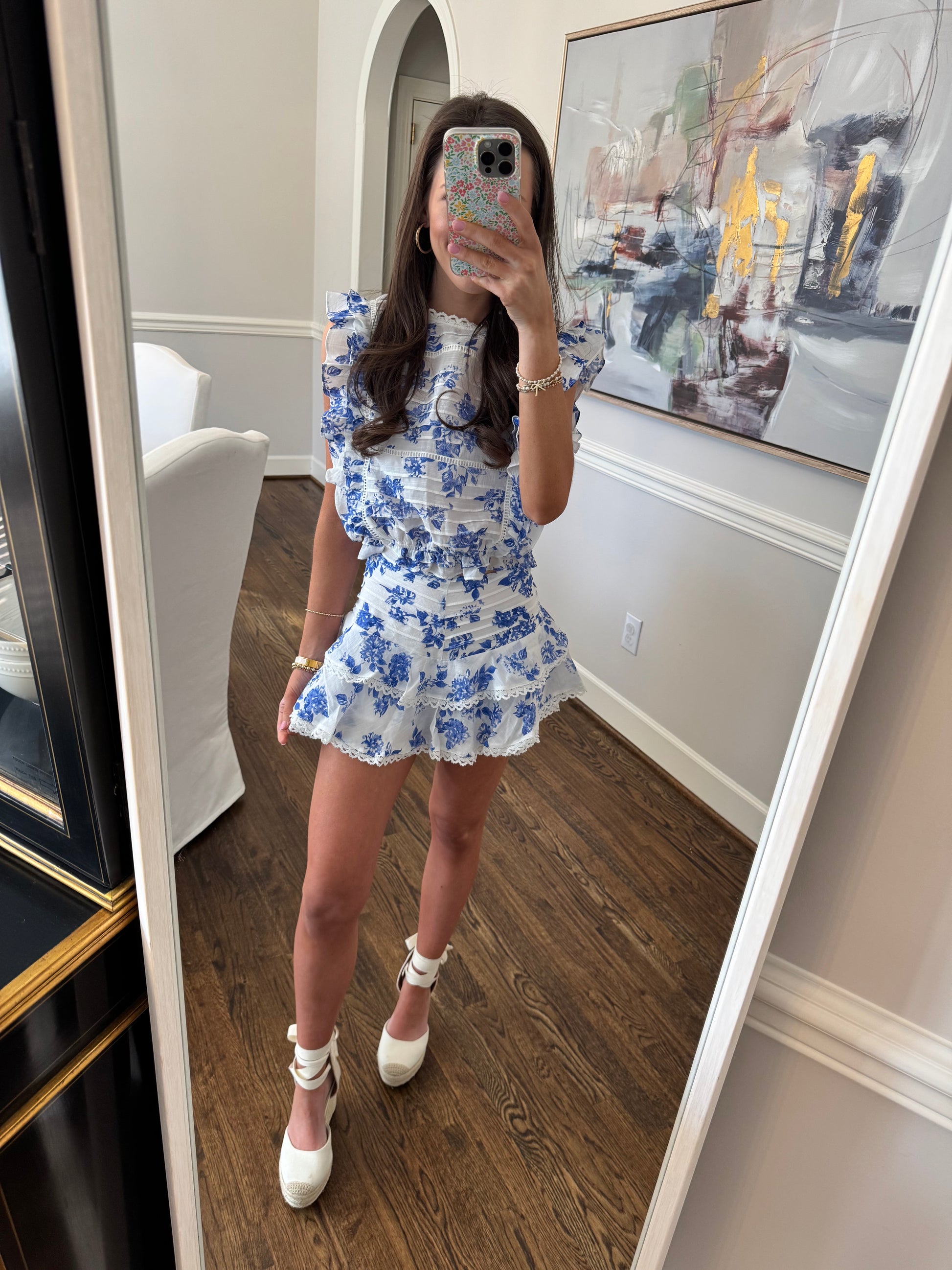 This set is so stunning on. If you are short like the model and looking for a set this was made for you. If you are in between sizes and are taller than 5'4 I would recommend sizing up. The model is 5'3 105 lb for reference. It does have tons of stretch in the skirt.